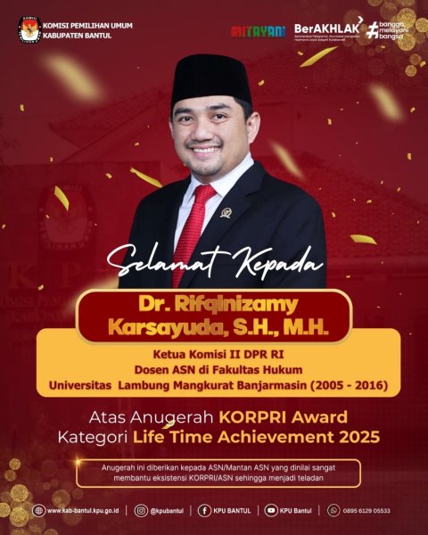 KPU Kabupaten Bantul mengucapkan selamat kepada Dr. Rifqinizamy Karsayuda, S.H., M.H. Ketua Komisi II DPR RI dan Dosen ASN di Fakultas Hukum Universitas Lambung Mangkurat Banjarmasin (2005-2016). Atas anugerah KORPRI Award Life Time Achievement 2025.