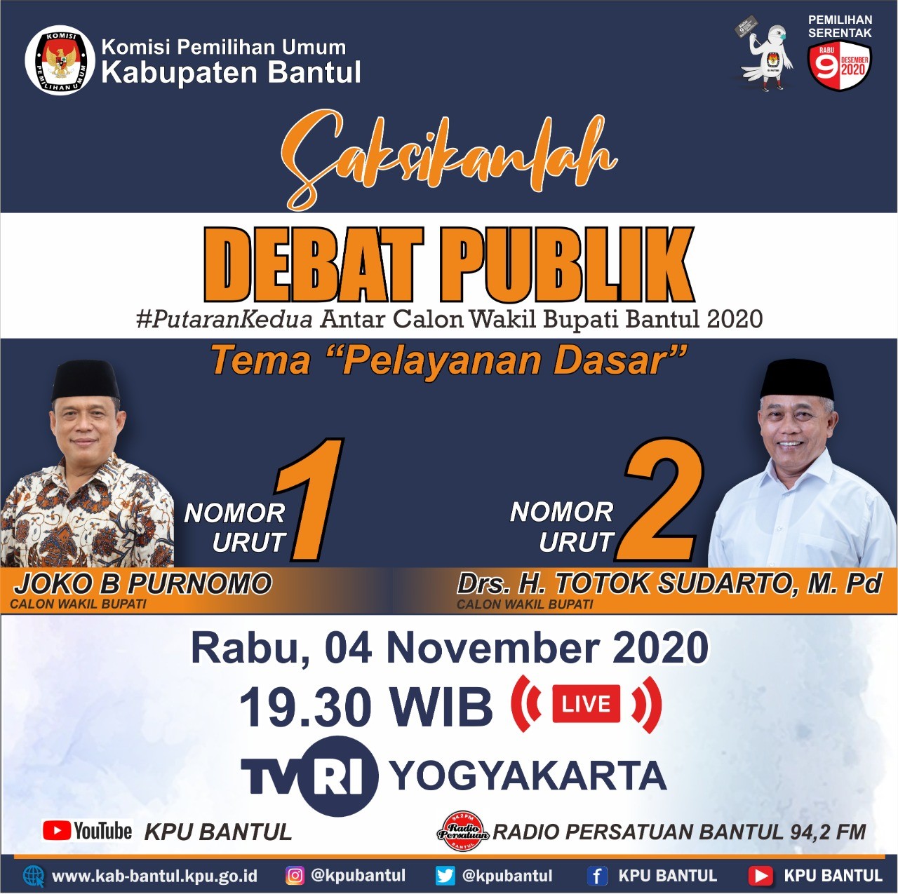 KPU Kabupaten Bantul kembali menggelar Debat Publik Putaran kedua di tanggal 04 November 2020. Debat Publik ke dua ini akan diikuti oleh masing-masing calon Wakil Bupati Bantul. Pada Debat Putaran kedua ini, KPU Bantul mengangkat tema "Pelayanan Dasar". Seperti pada saat pelaksanaan debat publik sebelumnya, Debat Publik putaran kedua ini dapat disaksikan secara live di Chanel TV TVRI Yogyakarta atau melalui streaming Youtube KPU Bantul pukul 19.30 WIB. KPU Bantul menghimbau agar masyarakat khususnya warga kabupaten Bantul dapat menyaksikan Debat Publik ini agar dapat mencermati visi, misi dan program kerja para kandidat pemilihan serentak 2020 sebagai bekal memilih di TPS tanggal 9 Desember 2020 mendatang.