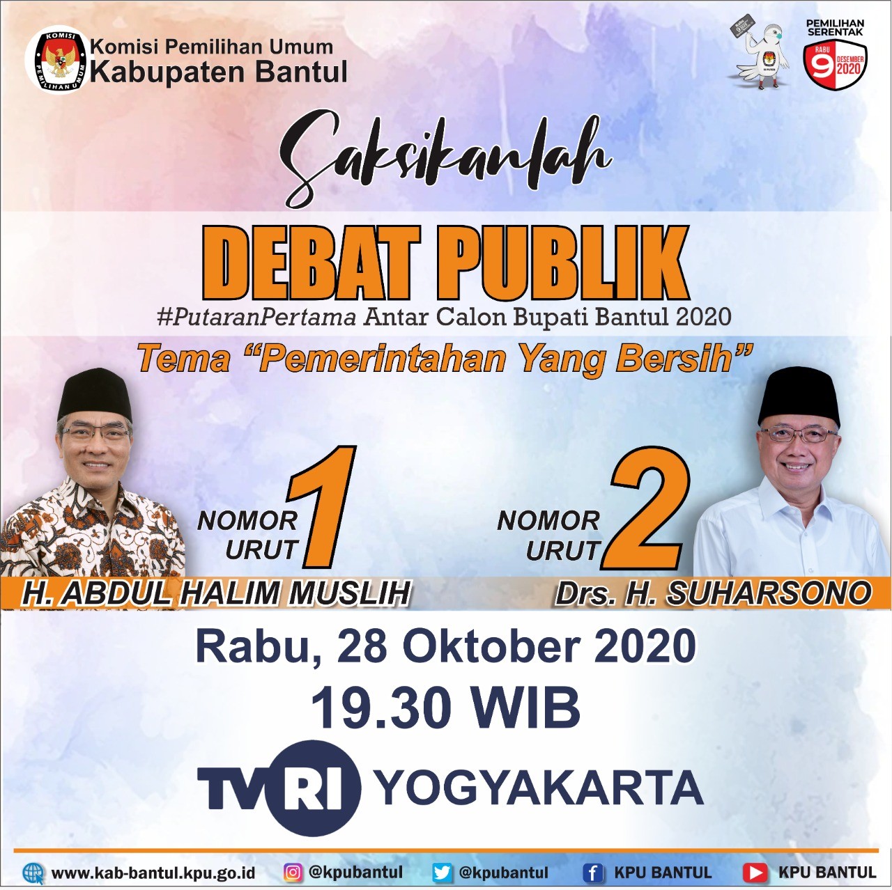Tanggal 28 Oktober 2020 nanti bukan saja diperingati sebagai hari Sumpah Pemuda, tetapi juga menjadi hari pertama dimulainya Debat Publik bagi Pasangan Calon Bupati dan Wakil Bupati Bantul tahun 2020. Pada Putaran pertama ini, masing-masing calon Bupati dari kedua Kandidat akan melakukan Debat Publik dengan tema "Pemerintah yang Bersih". Debat akan disiarkan langsung melalui saluran Televisi TVRI Jogja dan melalui chanel Youtube KPU Bantul pukul 19.30 WIB. Harapannya dengan diadakannya Debat Publik yang rencananya akan dilakukan sebanyak 3x, masyarakat bantul dapat lebih mengenal calon pemimpin Kabupaten Bantul, sehingga lebih mantap dalam memberikan hak pilih suaranya di TPS pada tanggal 9 Desember 2020.