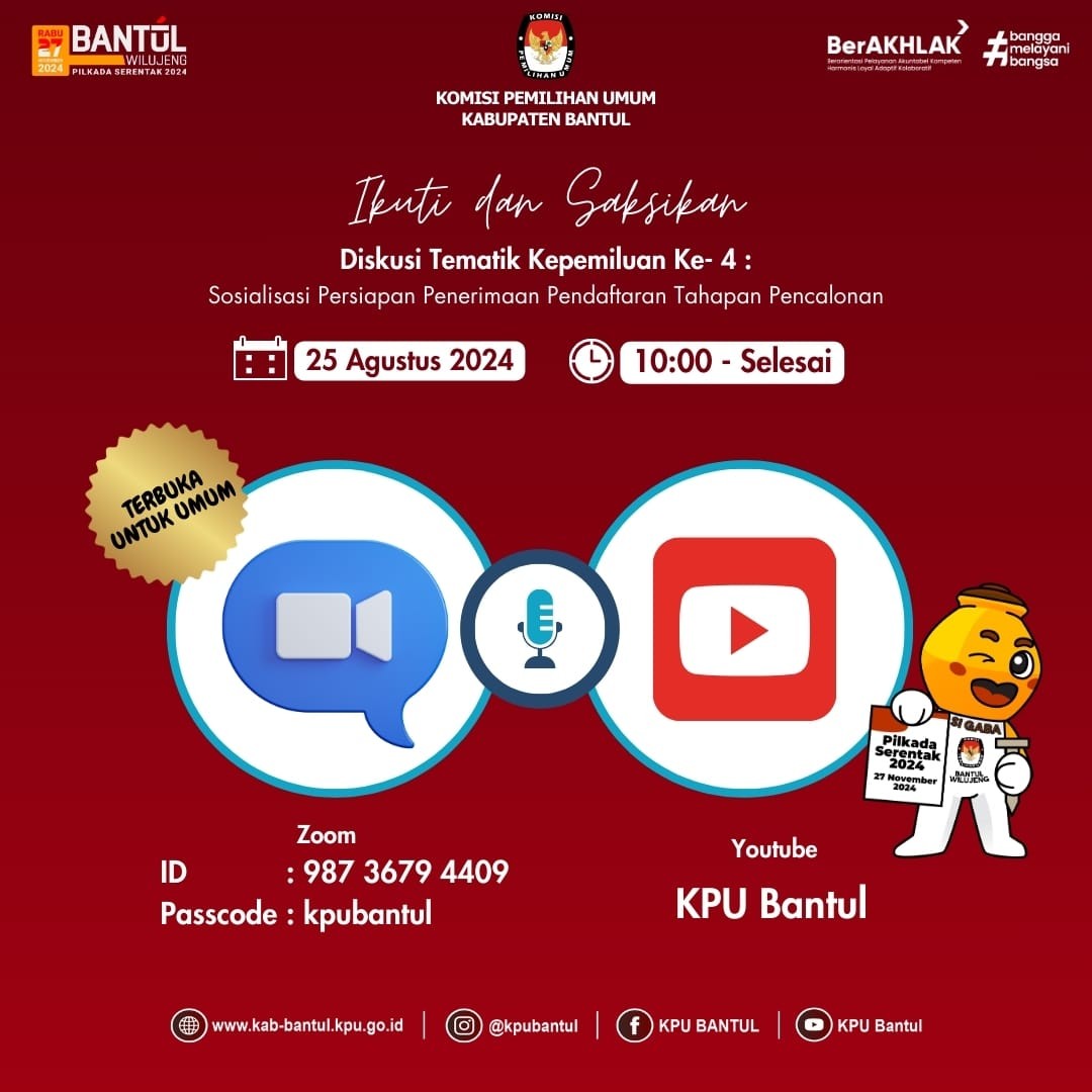 Ikuti dan saksikan diskusi tematik kepemiluan ke 4 dengan tema sosialisasi tahapan pencalonan persiapan penerimaan pendaftaran pasangan calon bupati dan wakil bupati Bantul Tahun 2024