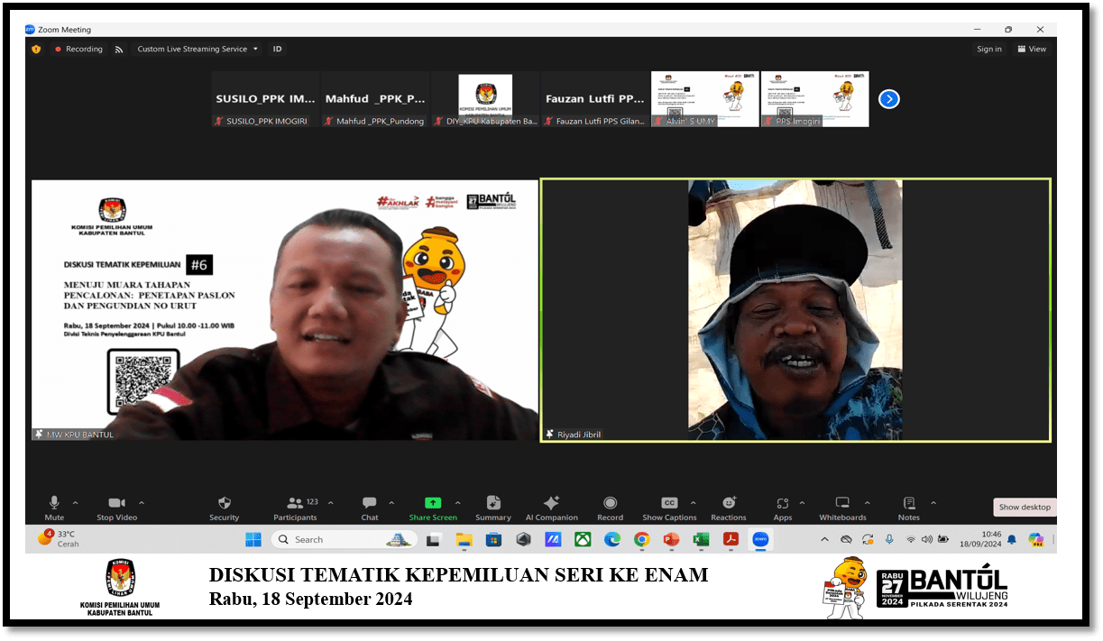 Rabu, 18 September 2024, pukul 10.00 s/d 11.00 WIB KPU Bantul menyelenggarakan Diskusi Tematik Kepemiluan ke enam dengan tema : Menuju Muara Tahapan Pencalonan Pilkada Bantul 2024. Tahapan pencalonan pilkada serentak tahun 2024 berdasarkan PKPU No 2 Tahun 2024 mulai pendaftaran paslon 27 Agustus 2024 dan penetapan paslonnya di tanggal 22 September 2024. Diskusi tematik dipandu oleh Kadiv Teknis Penyelenggaraan dan diikuti 140 badan adhoc KPU Bantul.
