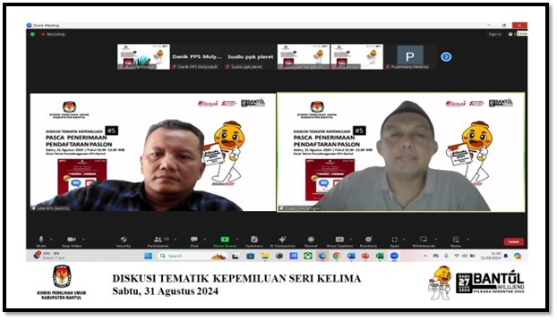 Sabtu, 31 Agustus 2024 – Serial diskusi tematik kepemiluan yang kelima terselenggara dengan tema “ Pasca Penerimaan Pendaftaran Pasangan Calon di Tahapan Pencalonan Pilkada 2024. Tujuan kegiatan ini adalah Sapa badan adhoc dan memberikan penguatan pengetahuan kepada PPK dan PPS Se Kabupaten Bantul untuk memberikan informasi di wilayah kerjanya tentang proses tahapan pencalonan hingga saat ini. Pukul 10.40 WIB diskusi melalui daring dibuka oleh Kadiv Teknis penyelenggaraan KPU Bantul yang sekaligus menjadi pemandu diskusi.