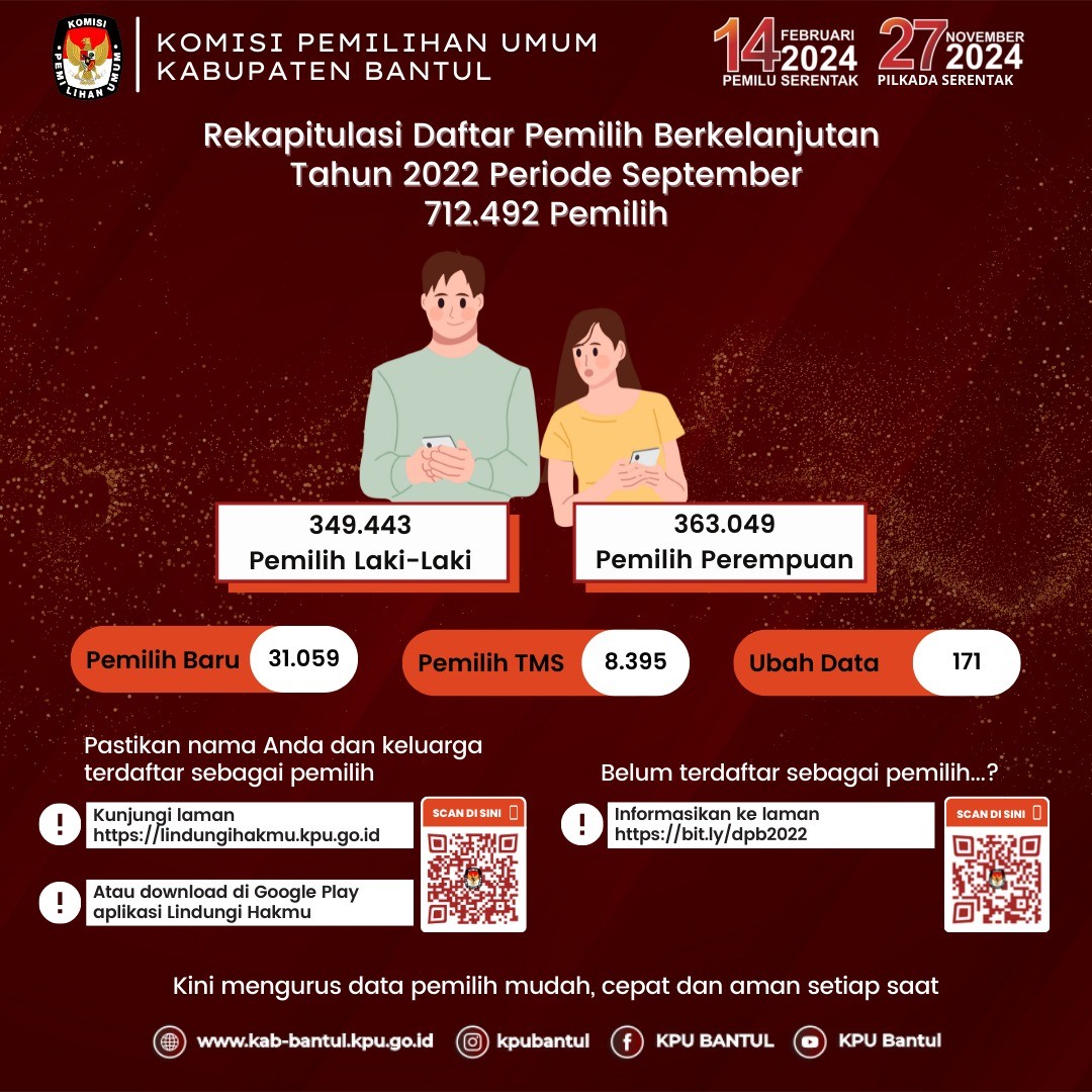 Tersebar di 17 Kapanewon dan 75 Kalurahan. Untuk memastikan nama anda dan keluarga terdaftar sebagai pemilih, kunjungi laman https://lindungihakmu.kpu.go id atau download aplikasi Lindungi Hakmu di Google Play