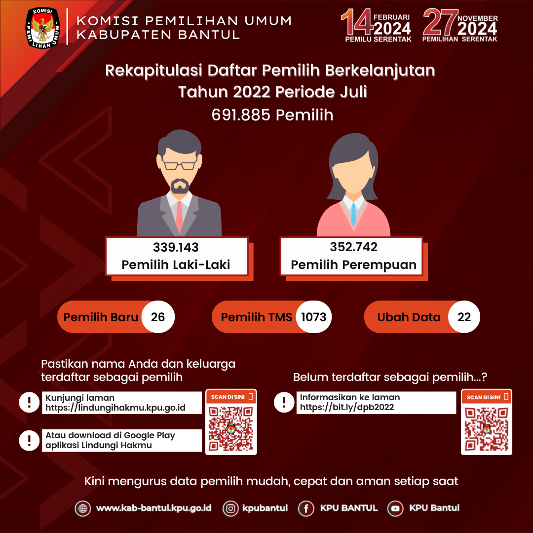 Hasil Rekapitulasi Daftar Pemilih Berkelanjutan periode Juli 2022 sejumlah 691.885 terdiri dari pemiih perempuan 352.742 orang dan pemilih laki-laki 339.143 orang . Tersebar di 17 kapanewon dan 75 kalurahan.