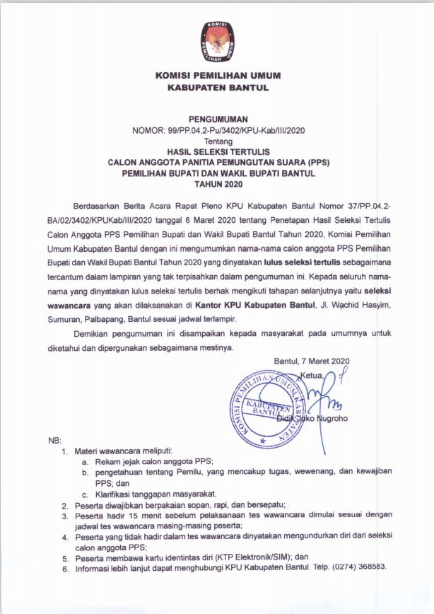 Berdasarkan Hasil Keputusan Komisi Pemilihan Umum Kabupaten Bantul yang tercantum dalam Pengumuman Nomor: 99/PP.04.2-Pu/3402/KPU-Kab/III/2020 tentang Hasil Seleksi Tertulis Calon Anggota Panitia Pemungutan Suara (PPS) Pemilihan Bupati dan Wakil Bupati Bantul Tahun 2020 dengan ini KPU Bantul mengumumkan nama-nama calon anggota PPS yang dinayatakan Lulus Seleksi Tertulis dan berhak mengikuti tahap selanjutnya yaitu Seleksi Wawancara di kantor KPU Kabupaten Bantul sesuai jadwal yang telah ditentukan. Daftar Calon Anggota PPS dan jadwal Pelaksanaan Seleksi Wawancara dapat diunduh dilink berikut ini.