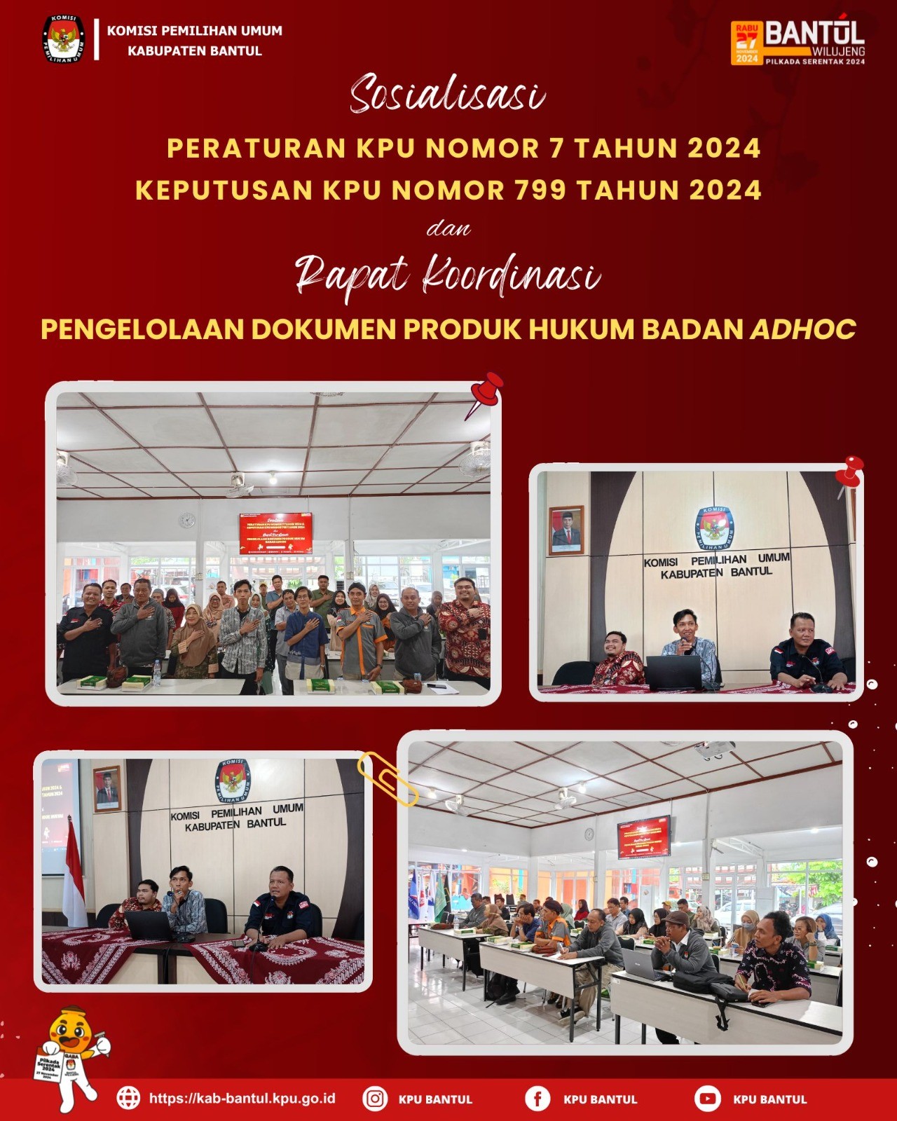Kamis,(4/7) KPU Kabupaten Bantul mengadakan Sosialisasi PKPU Nomor 7 Tahun 2024 dan Keputusan KPU Nomor 799 Tahun 2024 serta Rapat Koordinasi Pengelolaan Dokumen Produk Hukum Badan Adhoc yang bertempat di Pendopo KPU Kabupaten Bantul. Kegiatan ini mengundang Ketua dan Anggota PPK yang membidangi Hukum se-Kabupaten Bantul. Acara dihadiri Ketua Divisi Hukum dan Pengawasan, Ketua Divisi Perencanaan, Data dan Informasi, Ketua Divisi Teknis Penyelenggaraan beserta jajaran sekretariat KPU Kabupaten Bantul.