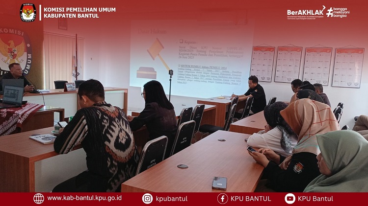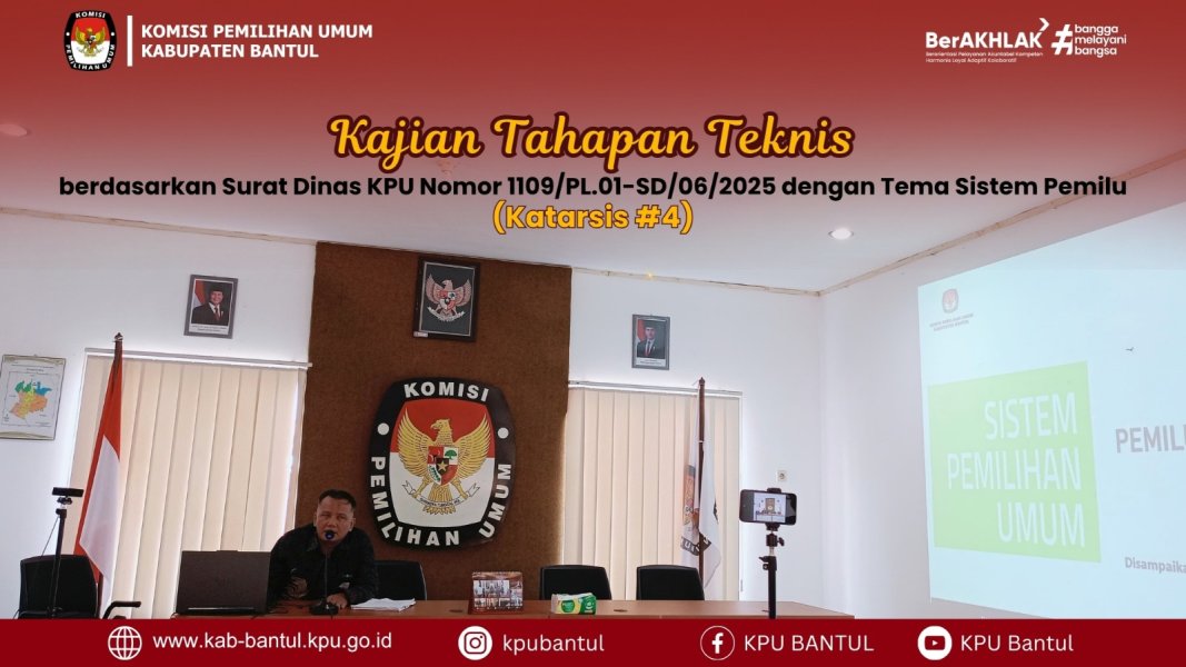 Rabu, 23 Juli 2025 Pukul 09.00 WIB, Divisi Teknis Penyelenggaraan KPU Kabupaten Bantul melaksanakan KATARSIS seri 4 dengan tema Sistem Pemilu dalam Pemilu Serentak Tahun 2024. Mestri Widodo menyampaikan bahwa penyelenggaraan pemilu serentak tahun 2024 mendasarkan pada UU No 7 Tahun 2017 Tentang Pemilihan Umum. Selanjutnya dalam penjelasannya menyampaikan bahwa sistem pemilu untuk penentuan Presiden dan Wakil Presiden yang dipilih secara langsung oleh rakyat mengunakan suara terbanyak atau lebih dari 50 % sesuai Pasal 416 UU No 7/2017; Jenis Pemilu DPR dan DPRD menggunakan sistem proporsional terbuka sesuai dengan pasal 168 ayat (2) UU No 7/2017; sedangkan jenis pemilu Dewan Perwakilan Daerah (DPD) menggunakan sistem distrik berwakil banyak dan penentuan calon terpilihnya berdasarkan suara terbanyak peringkat 1 hingga 4 sesuai dengan Pasal 423 ayat (1) UU No 7 /2017. Sesi katarsis diakhiri dipukul10.00 WIB dengan mengingatkan bahwa kegiatan ini bagian upaya pengetahuan tentang kepemiluan untuk internal dan semoga menjadi keberkahan bersama,aamiin.