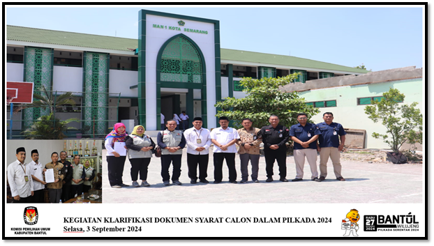 Tim KPU Bantul yang terdiri dari Joko Santosa (Ketua), Mestri Widodo (Kadiv Teknis Penyelenggara), Diwangkara (Staff subag Teknis) dan Erwan (Staff subbag hukum) serta Haris (Staff Subag KUL) melakukan klarifikasi ke Sekolah Tingkat SLTA di Kota Semarang untuk memastikan kebenaran nama yang ada dalam ijazah. Output dari proses klarifikasi dituangkan dalam formulir Model BA.KLARIFIKASI.KWK dengan nomor 116/PL.02.2-BA/3402/2024 tertanggal 3 September 2024. Selain kegiatan klarifikasi KPU Bantul juga melakukan kegiatan konfirmasi kepada instansi yang berwenangn sebagai bagian dari penguatan kebenaran kelengkapan dokumen syarat calon. Instansi KPU Bantul melakukan konfirmasi antara lain