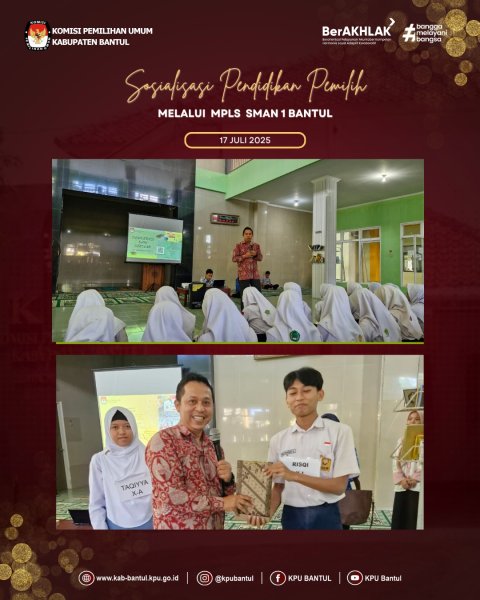 Komisi Pemilihan Umum (KPU) Kabupaten Bantul kembali menunjukkan komitmennya dalam mencerdaskan pemilih pemula dengan menggelar sosialisasi pendidikan pemilih di SMAN 1 Bantul. Kegiatan ini menjadi bagian dari rangkaian MPLS Hari ke-4 yang berlangsung hari ini, Kamis (17/7). Dalam lawatan istimewa tersebut, Ketua KPU Bantul, Joko Santosa, memberikan materi kepada 324 siswa kelas 10. Ia menjelaskan tentang pentingnya demokrasi dan mekanisme Pemilu di Indonesia.