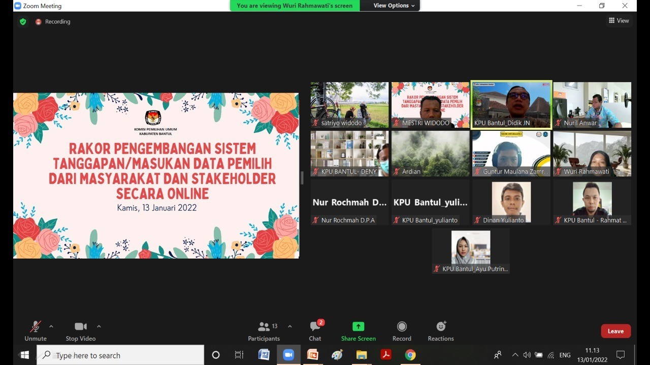 Dalam paparannya Wuri Rahmawati, Ketua Divisi Perencanaan Data dan Informasi KPU Kabupaten Bantul menyampaikan bahwa tujuan rapat koordinasi hari ini untuk mendiskusikan sistem online tanggapan atau masukan data yang mudah untuk diakses dan diisi oleh masyarakat maupun stakeholder dalam kegiatan Pemutakhiran Data Pemilih Berkelanjutan (PDPB) dengan tetap memerhatikan keamanan data pribadi. Menurutnya tanggapan atau masukan data dari masyarakat dan stakeholder ini menjadi bahan untuk menyandingkan data dalam upaya pemutakhiran data pemilih di wilayah Kabupaten Bantul. Oleh karena itu, perlu untuk mengembangkan sistem online agar tanggapan atau masukan data dari masyarakat dan stakeholder dapat diterima oleh KPU Kabupaten Bantul dengan cepat, akurat dan mutakhir, tuturnya.