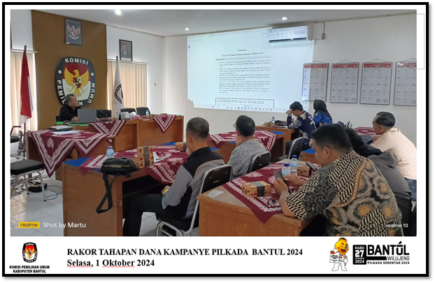 Selasa, 1 Oktober 2024, Pukul 10.00 WIB KPU Bantul menyelenggarakan koordinasi dengan Petugas Penghubung (LO) Paslon, Bawaslu Bantul, Polres Bantul, Bakesbangpol dan Tapem Pemda Bantul untuk menguatkan pelaksanaan Kegiatan Tahapan Dana Kampanye Pilkada Bantul 2024. Hadir dalam rakor tersebut Rifki dan Salsabila (Bawaslu Bantul), Darmanto (Polres Bantul), Fitra dan Ari (LO Paslon 01), Patra (LO Paslon 02), Adip (LO Paslon 03) dan Nur Albait (Bakesbangpol). Ketua Divisi Teknis Penyelenggaraan KPU Bantul, Mestri Widodo memandu kegiatan dan membuka materi rakor tentang pedoman regulasi kegiatan tahapan dana kampanye dalam Pilkada Serentak Tahun 2024, yaitu