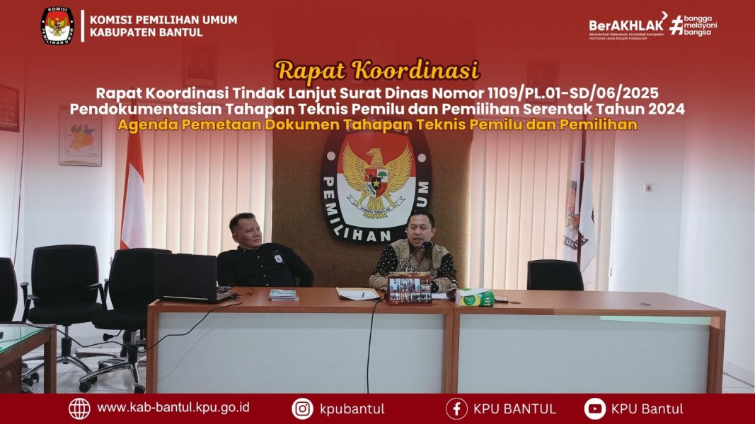 Kamis 24 Juli 2025 Pukul 13.30 WIB, Divisi Teknis Penyelenggaraan KPU Kabupaten Bantul melakukan kegiatan koordinasi untuk melaksanakan proses pendokumentasian tahapan teknis pemilu dan pemilihan serentak tahun 2024. Pentingnya kegiatan pendokumentasian yang harus dilakukan oleh KPU Kabupaten Bantul sebagai Lembaga publik menjadi hal yang ditegaskan Ketua KPU Bantul, Joko Santosa. Beliau juga menambahkan bahwa KPU Kabupaten Bantul sebagai penyelenggara pemilu dan pemilihan Tingkat kabupaten tentu memiliki data-data yang bisa dipergunakan untuk pengembangan pengetahuan dan hal teknis penyelenggaraan pemilu kedepan. Proses kegiatan rakor dipandu oleh Mestri Widodo dan diikuti oleh seluruh jajaran secretariat KPU Bantul. Rakor menyimpulkan bahwa untuk menyelesaikan tugas pendokumentasian maka divisi teknis telah membuat kebijakan kegiatan yang sudah ditata baik sumber dokumen dan waktunya dengan harapan pada awal Bulan September 2025, mandat KPU yang tertera dalam SD KPU No 1109/2025 diselesaikan tepat waktu.