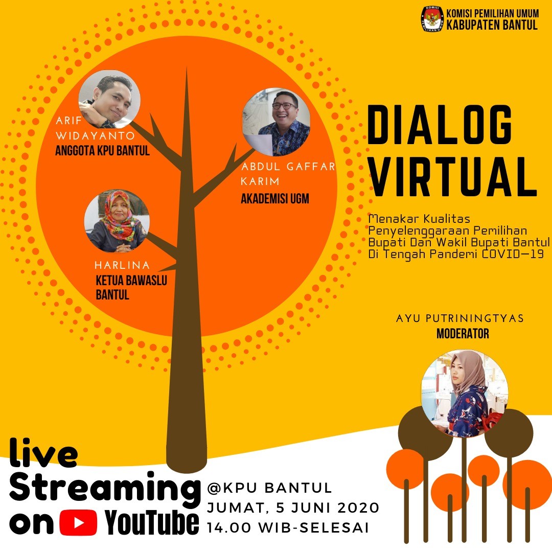 KPU Kabupaten Bantul akan mengadakan dialog virtual sesi 2 dengan tema "Menakar Kualitas Penyelenggaraan Pemilihan Bupati dan Wakil Bupati di tengah Pandemi Covid-19 besuk pada Hari Jum'at, 5 Juni 2020 dengan menggunakan aplikasi zoom meeting.