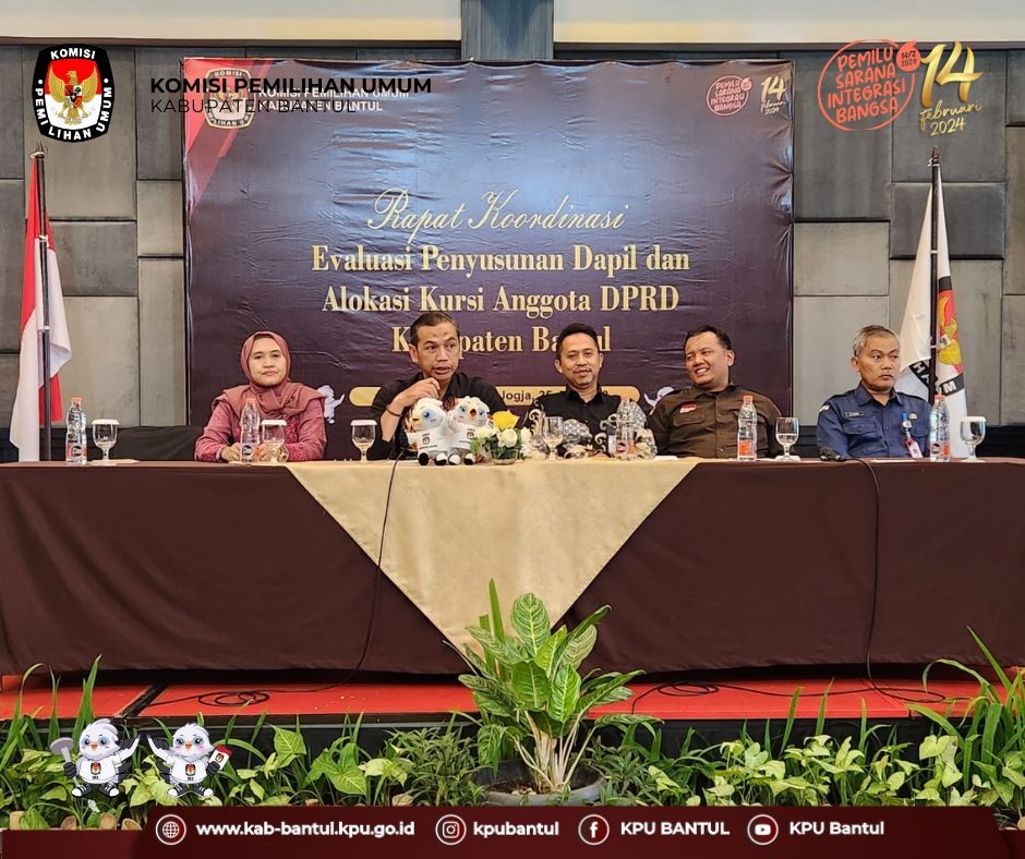 KPU Kabupaten Bantul pada hari Selasa (25/7) mengadakan Rapat koordinasi evaluasi Penyusunan daerah pemilihan (dapil) dan alokasi kursi Anggota DPRD Kabupaten Bantul Pemilu 2024. Rapat yang diselenggarakan di Hotel Grand Rohan Jogja ini diikuti oleh Dinas /Instansi terkait, 18 partai peserta pemilu, LSM dan PPK se Kabupaten Bantul.