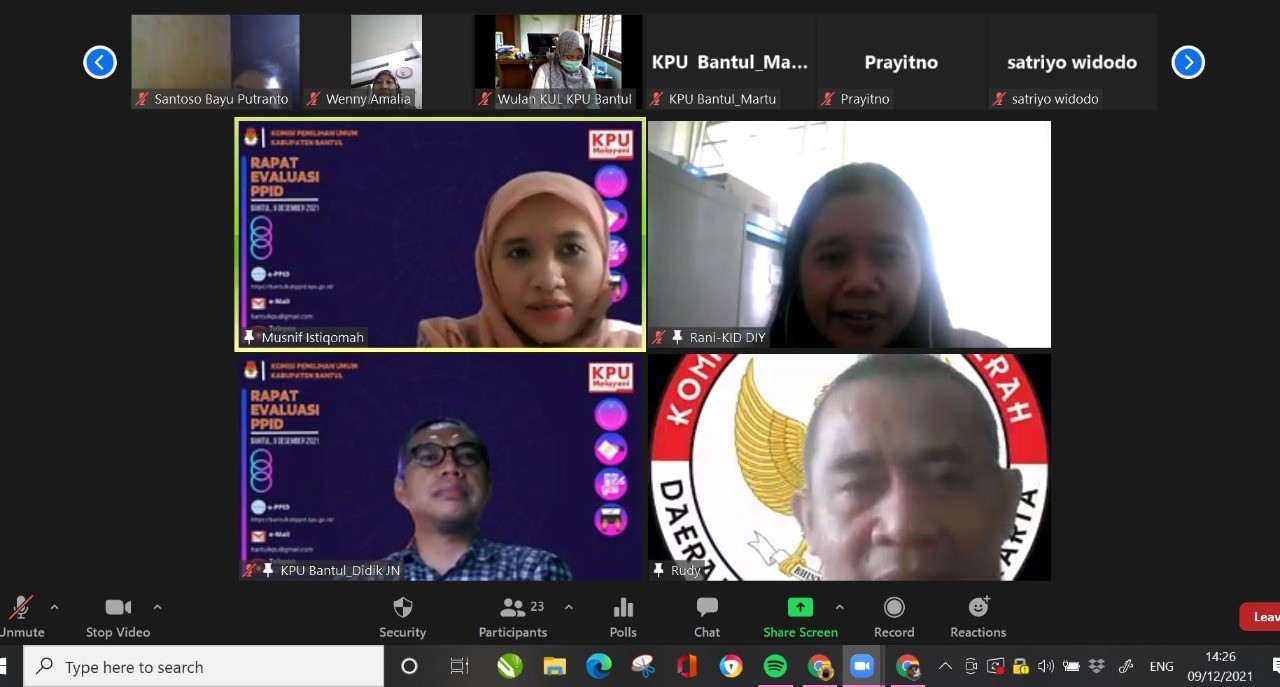 Kamis (9 /12) KPU Kabupaten Bantul melakukan Evaluasi PPID KPU Bantul secara daring. Acara yang dihadiri oleh 4 (empat) orang anggota Komisioner dari Komisi Informasi DIY (KI-DIY) ini diikuti oleh semua pegawai di KPU Bantul. Hal ini dilakukan berangkat dari rasa kegelisahan terhadap hasil penilaian monitoring dan evaluasi PPID di KPU Bantul oleh KI-DIY yang relatif belum memuaskan (Kurang Informatif).