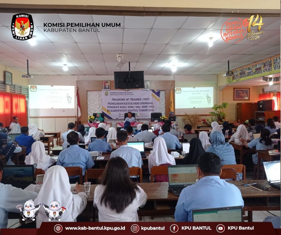 Senin-Selasa (28-29/8) KPU Kabupaten Bantul menjadi narasumber Training of Trainer (ToT) Pemilihan Ketua OSIS (Pemilos) untuk jenjang SMP. Kegiatan yang diselenggarakan oleh Bakesbangpol Bantul ini berlangsung 2 (dua) hari. Pada hari pertama, ketua Divisi Hukum dan Pengawasan, Mestri Widodo memberikan materi dengan peserta dari 52 sekolah. Sementara pada hari kedua, Ketua Divisi Perencanaan, Data dan Informasi, Wuri Rahmawati memberikan materi dengan peserta dari 44 sekolah. Masing-masing sekolah mengirimkan guru dan siswa.