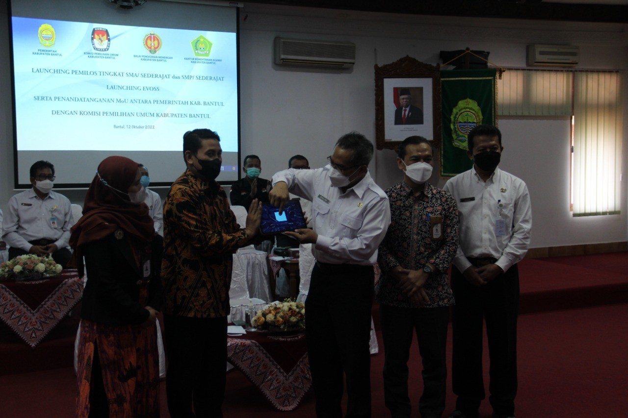 Rabu, (12/10) KPU Bantul bersama Bupati Bantul, Abdul Halim Muslim melaunching Pemilihan Ketua OSIS (Pemilos) tingkat SMA/SMK/MA/SMP/MTs serentak se-Kabupaten Bantul sekaligus melaunching aplikasi E-pemilos Kabupaten Bantul yang diberi nama “Evoss” (Electronic Voting System for Student ). Acara yang berlangsung di Gedung Manggala Madya Sabha Parasamya dan dilaksanakan secara hybrid ini dihadiri oleh KPU DIY bersama Pemerintah Kabupaten Bantul dalam hal ini Asisten Pemerintahan, Didik Warsito, Badan Kesatuan Bangsa dan Politik dan Dinas Komunikasi dan Informasi serta Dinas Instansi terkait yaitu Dinas Pendidikan, Pemuda dan Olah Raga, Dinas Kependudukan dan Catatan Sipil. Kementerian Agama Bantul dan Balai Pendidikan Menengah.