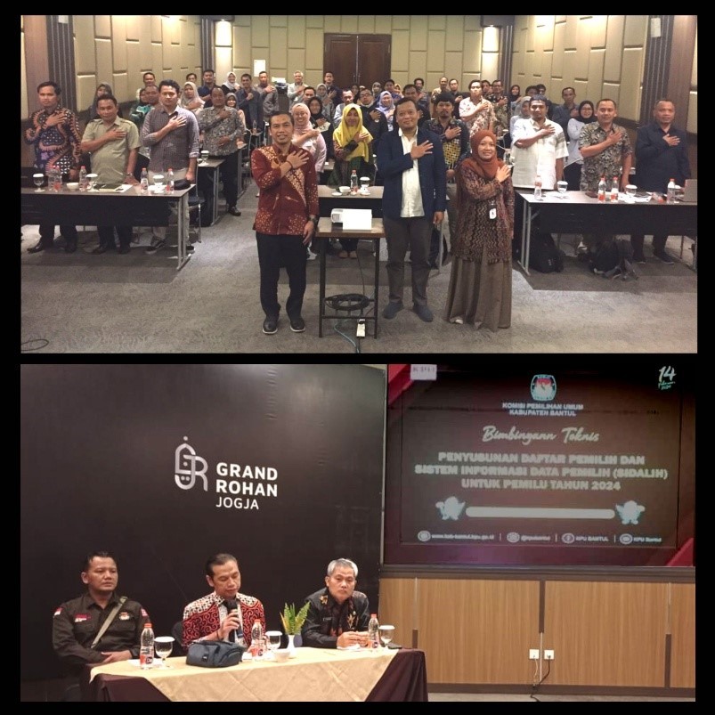 Komisi Pemilihan Umum (KPU) Kabupaten Bantul, Sabtu dan Minggu, 4 dan 5 Februari 2023, menyelenggarakan Bimbingan Teknis Penyusunan Daftar Pemilih dan Sistem Informasi Data Pemilih (Sidalih) untuk Pemilu tahun 2024 di Grand Rohan Jogja, Jl. Raya Janti Jl. Gedongkuning No.336, Modalan, Banguntapan, Kec. Banguntapan, Kabupaten Bantul, Daerah Istimewa Yogyakarta.