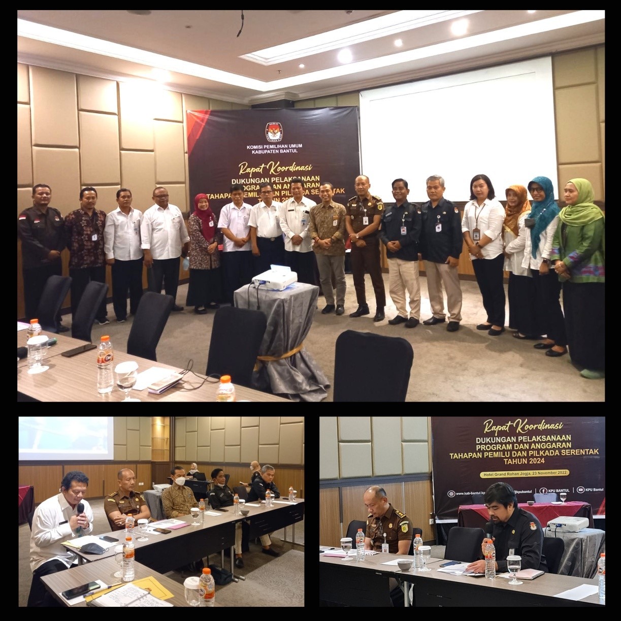 KPU Bantul melaksanakan kegiatan Rapat Koordinasi Dukungan Pelaksanaan Program dan Anggaran Tahapan Pemilu dan Pilkada Serentak Tahun 2024 bersama sejumlah instansi terkait, Rabu (23/11/2022), di Hotel Grand Rohan Jogja. Kegiatan ini diselenggarakan sebagai upaya melakukan pembahasan secara detail terkait Rencana Anggaran Belanja (RAB) untuk Pilkada Serentak Tahun 2024.