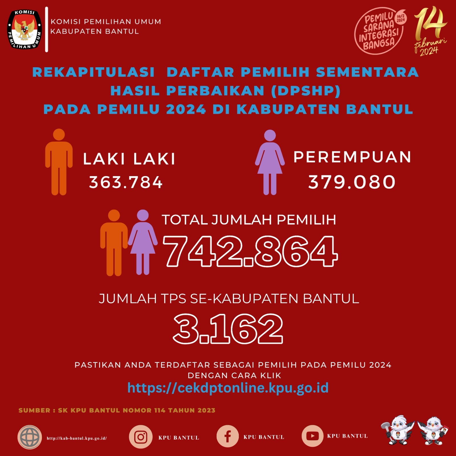 KPU Bantul menggelar Rapat Pleno Terbuka Rekapitulasi dan Penetapan Daftar Pemilih Sementara Hasil Perbaikan (DPSHP), Jumat (13/5/2023), bertempat di Pendopo KPU Bantul. Hadir dalam kegiatan ini Anggota KPU DIY, Siti Ghoniyatun, Komisioner dan Sekretaris KPU Bantul, perwakilan dari Polres Bantul, Kodim 0729/Bantul, serta Organisasi Perangkat Daerah (OPD) di Kabupaten Bantul, Disdukcapil dan Kesbangpol. Juga dihadiri Partai politik (Parpol) di Kabupaten Bantul antara lain Partai Buruh, PDI Perjuangan, Partai Keadilan Sejahtera (PKS), Partai Ummat, Golkar, Partai Gelora, Gerindra, serta Panitia Pemilihan Kecamatan (PPK) se-Kabupaten Bantul.