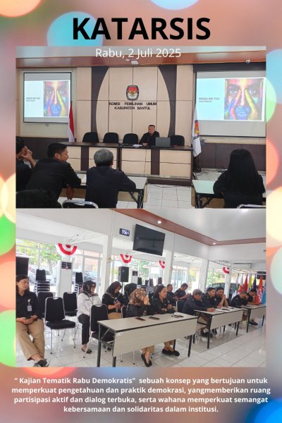 Rabu, 2 Juli 2025, Divisi Teknis Penyelenggaraan KPU Bantul menyelenggarakan kegiatan Kajian Tematik Rabu Demokratis disingkat Katarsis bertempat di Pendopo. Katarsis merupakan sebuah konsep yang bertujuan untuk memperkuat pengetahuan dan praktik demokrasi, yang memberikan ruang partisipasi aktif dan dialog terbuka, serta wahana memperkuat semangat kebersamaan dan solidaritas internal.