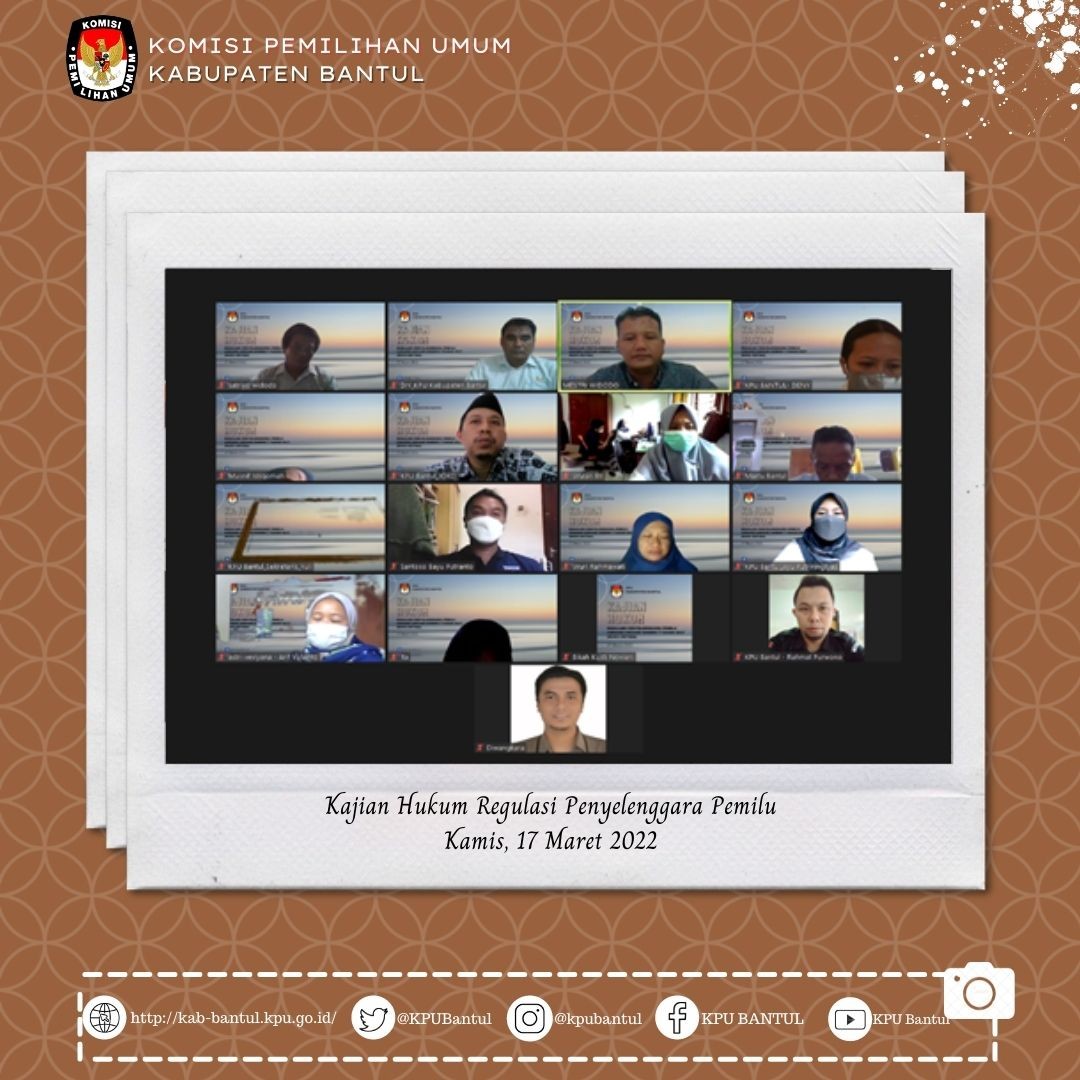 Kamis, 17 Maret 2022 pukul 13.00 WIB, KPU Bantul mengadakan “Kajian Hukum Regulasi Penyelenggara Pemilu” secara daring.