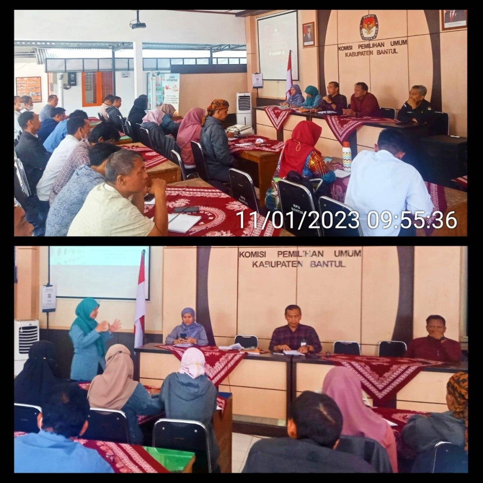 Komisi Pemilihan Umum (KPU) Kabupaten Bantul, Rabu, 11 Januari 2023, menyelenggarakan Rapat Koordinasi Pemetaan Tempat Pemungutan Suara (TPS) berdasarkan data hasil sinkronisasi Daftar Penduduk Potensial Pemilih Pemilihan (DP4) dengan Daftar Pemilih Tetap (DPT) Pemilihan Terakhir yang telah dimutakhirkan secara berkelanjutan di Pendopo KPU Kabupaten Bantul, Sumuran, Palbapang, Bantul.
