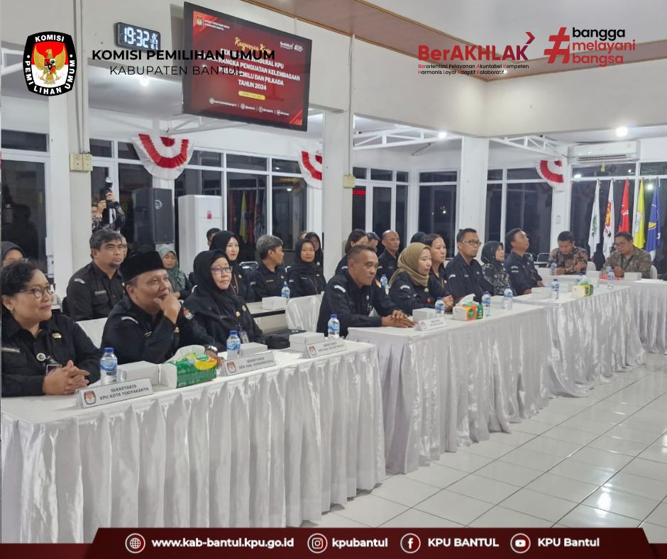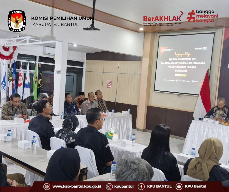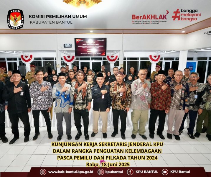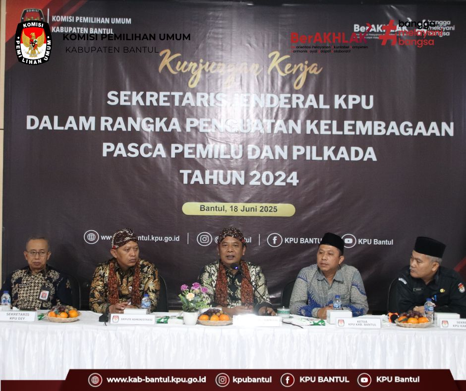 Rabu (18/6) KPU Kabupaten Bantul menerima kunjungan kerja Sekretaris Jenderal KPU, Bernad Dermawan Sutrisno dalam rangka penguatan kelembagaan pasca Pemilu dan Pilkada Tahun 2024. Hadir bersama rombongan, Deputi Bidang Administrasi, Suryadi, Sekretaris KPU DIY, Tri Tujiana, Sekretaris KPU Provinsi Jawa Tengah, Arif Sujaí, Plt. Sekretaris KPU Provinsi Jawa Barat, Syakir dan para pejabat eselon III KPU RI serta para Sekretaris KPU Kabupaten/Kota se DIY. Rombongan yang disambut oleh seluruh keluarga besar KPU Kabupaten Bantul ini diterima di pendopo kantor. Diawali dengan laporan Sekretaris KPU Kabupaten Bantul, Yayulianto bahwa jumlah pegawai sekretariat terdiri dari 17 ASN, 5 PPPK dan 6 PPNPN di mana 3 diantaranya masih berproses menjadi PPPK serta 1 CPNS. Sedangkan Ketua KPU Kabupaten Bantul, Joko Santosa dalam sambutannya menyampaikan terima kasih atas kedatangan rombongan.