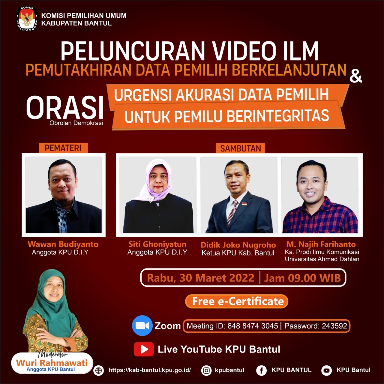 Komisi Pemilihan Umum (KPU) Kabupaten Bantul melakukan peluncuran video Iklan Layanan Masyarakat (ILM) Pemutakhiran Data Pemilih Berkelanjutan (PDPB) pada hari Rabu tanggal 30 Maret 2022. Kegiatan ini dilakukan serangkaian dengan acara Obrolan Demokrasi (Orasi) “Urgensi Akurasi Data Pemilih Untuk Pemilu Berintegritas” itu, diselenggarakan melalui Zoom Meeting dan Live Youtube KPU Bantul.