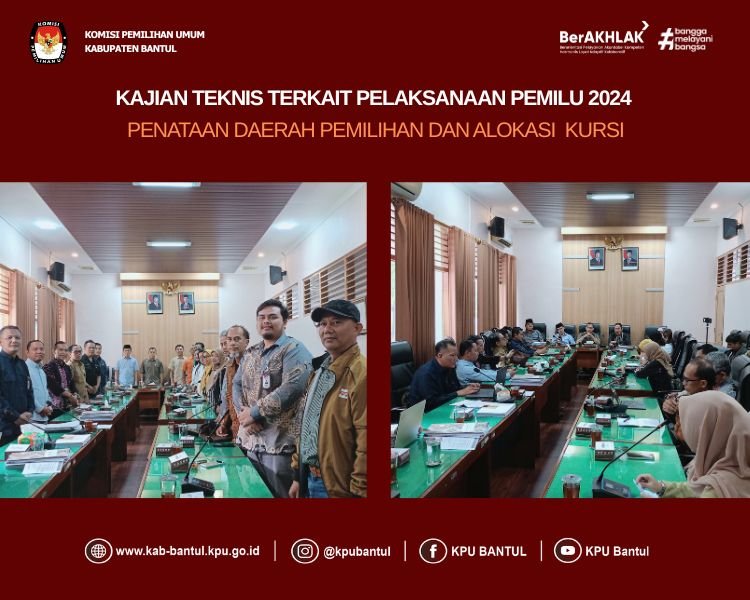 Senin, 4 Agustus 2025 Pukul 09.00 WIB, KPU Kabupaten Bantul melaksanakan Kegiatan Kajian Tahapan Teknis berdasarkan Surat Dinas KPU Nomor 1109/PL.01-SD/06/2025 dengan Tema penataan daerah pemilihan dan alokasi kursi pada pelaksanaan pemilu dan pemiliha tahun 2024. Acara dilaksanakan di Ruang Rapat Komisi A DPRD Bantul dan dihadiri oleh Ketua KPU DIY, Ketua dan Anggota Komisi A DPRD Bantul, Ketua dan Anggota KPU Bantul, Ketua Bawaslu Bantul, Kepala BPS Bantul, Kepala Disdukcapil Bantul, serta Ketua atau LO 18 Partai Politik Tingkat Kabupaten Bantul.