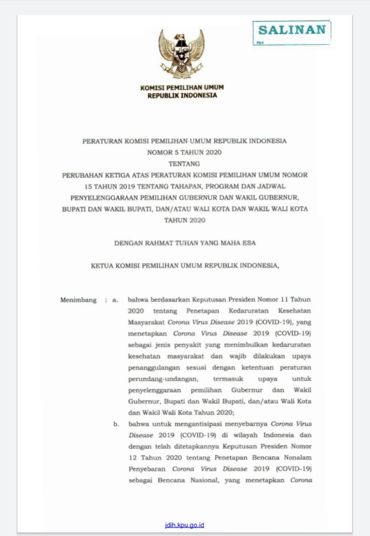 KPU RI sudah mengeluarkan Peraturan Komisi Pemilihan Umum Nomor 5 Tahun 2020 tentang Perubahan Ketiga atas Peraturan Komisi Pemilihan Umum Nomor 15 Tahun 2019 tentang Tahapan, Program dan Jadwal Penyelenggaraan Pemilihan Gubernur dan Wakil Gubernur, Bupati dan Wakil Bupati dan atau Walikota dan Wakil Walikota Tahun 2020