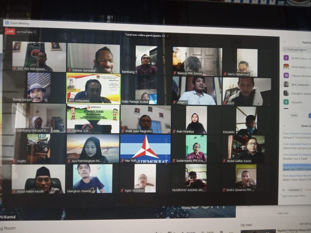 KPU Bantul menggelar dialog virtual seri 2 dengan tema “Menakar Kualitas Penyelenggaraan Pemilihan Bupati dan Wakil Bupati Bantul di tengah Pandemi Covid-19. Diskusi yang telah dilaksanakan pada tanggal 5 Juni 2020 ini selain menghadirkan narasumber dari internal KPU, yaitu Kadiv Perencanaan,Data dan Informasi KPU Bantul juga menghadirkan dari Dosen FIsipol UGM, Abdul Ghaffar Karim dan Ketua Bawaslu Bantul, Harlina dengan moderator dari sekretariat KPU Bantul, Ayu Putriningtyas.