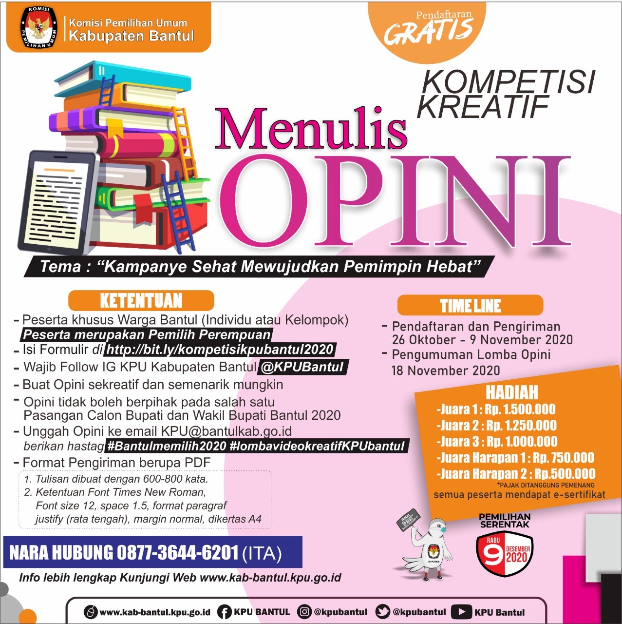 KPU Kabupaten menyelenggarakan Kompetisi Kreatif dengan Tema "Kampanye Sehat Mewujudkan Pemimpin Hebat". Kompetisi Kreatif ini terdiri dari tiga jenis perlombaan. Salah satunya adalah Lomba Menulis Opini untuk Pemilih Perempuan. Segala Ketentuan dan Persyaratan Lomba Menulis Opini yang wajib diketahui oleh peserta adalah sebagai berikut: