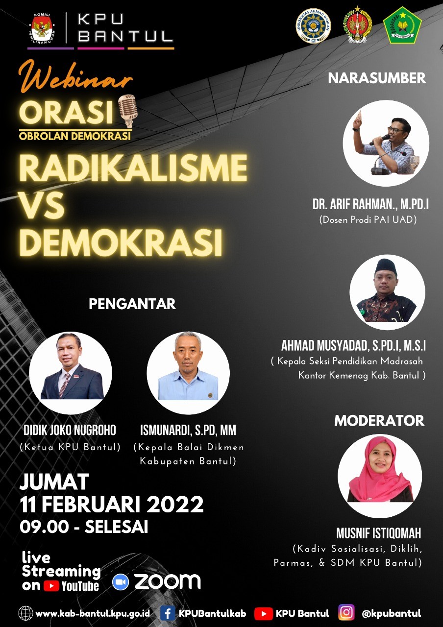 Jum'at (11/2) KPU Kabupaten Bantul akan mengadakan webinar Obrolan Demokrasi (Orasi) bertajuk Radikalisme VS Demokrasi. Mengundang semua Ketua dan pengurus OSIS SMA/SMK/MA dan SMP/MTs dengan menghadirkan narasumber dari UAD (Dr Arif Rahman, M.Pd.I) dan Kemenag Bantul (Ahmad Musyadad, S.Pd.I.,M.S.I). Acara yang dalam jadwal dimoderatori oleh Ketua Divisi SDM dan Parmas (Musnif Istiqomah) ini akan diberikan pengantar oleh Ketua KPU Bantul , Didik Joko Nugroho dan Ketua Balai Dikmen Kabupaten Bantul, Ismunardi, S.Pd.,MM.