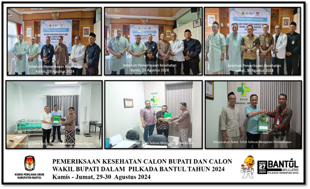 Jumat , 30 Agustus 2024 – KPU Kabupaten Bantul melaksanakan kegiatan pemeriksaan kesehatan bagi calon bupati dan calon wakil bupati yang telah diusulkan oleh gabungan partai politik peserta pemilu 2024 di RSUD Panembahan Senopati Bantul, dengan rentang waktu pemeriksaan kesehatan yang telah diatur dalam PKPU No 8 Tahun 2024 yaitu mulai 27 Agustus sampai dengan 2 September 2024.