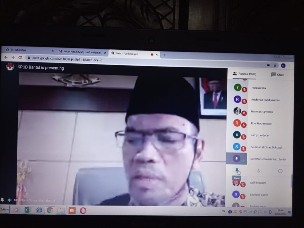 Dalam rangka mempersiapkan pelaksanaan pemilihan bupati dan wakil bupati Bantul tanggal 09 Desember 2020 yang akan datang, KPU Bantul menggelar dialog virtual dengan tema “menakar kesiapan penyelenggaraan Pemilihan Bupati dan Wakil Bupati Bantul ditengah pendemi covid19”. Pada dialog tersebut Ketua KPU Bantul, Didik Joko Nugroho memaparkan bahwa pelaksanaan Pemilihan Bupati dan Wakil Bupati akan kembali dimulai tahapannya tanggal 15 Juni 2020. Lebih lanjut dijelaskan bahwa mengingat situasi secara nasional maupun lokal masih dalam tahap pengendalian wabah covid19, maka setiap tahapan pilkada akan dilaksanakan dengan protokol kesehatan yang ketat. Untuk kebutuhan protokol kesehatan ini saat ini KPU Bantul sedang melakukan inventarisasi kebutuhan serta menghitung anggaran untuk selanjutnya diusulkan ke KPU pusat melalui KPU DIY. Didik menambahkan bahwa dalam pelaksanaan tahapan di tengah pendemi ini tentunya juga akan ada penyesuaian hal-hal teknis seperti pelaksanaan pencocokan dan penelitian (coklit), pelaksanaan kampanye, serta pelaksanaan pemungutan dan penghitungan suara. Prinsipnya kegiatan tahapan selain ketat dengan protokol kesehatan juga akan dilakukan modifikasi agar tidak terjadi kerumunan maupun terjadi peluang penularan covid 19.