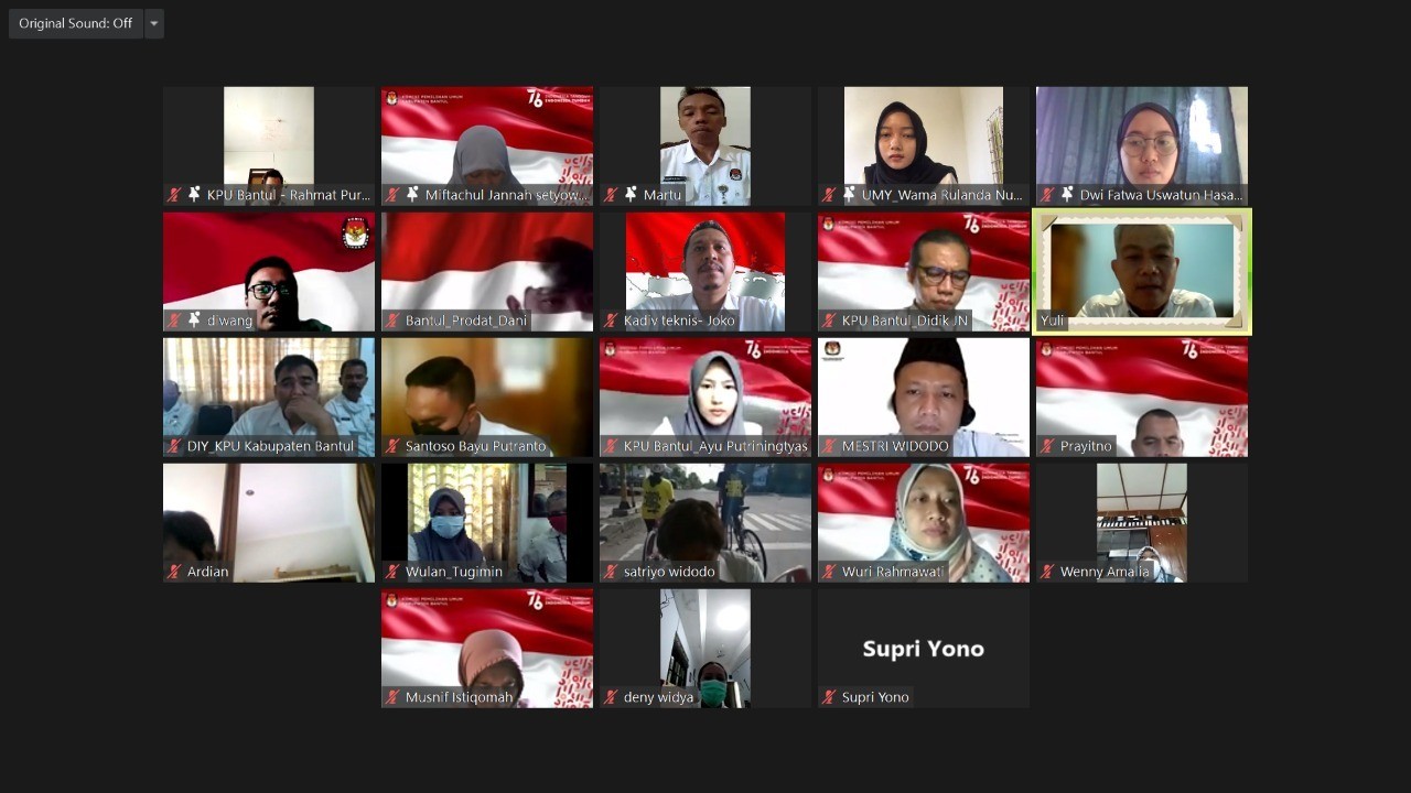 Dalam rangka menindaklanjuti Surat Edaran dan Kebijakan dari KPU RI, pada Senin 27 September 2021 masih dalam kondisi pandemi, KPU Bantul melaksanakan apel pagi rutin secara virtual , kegiatan ini merupakan salah satu sarana koordinasi dan komunikasi Komisioner dan Jajaran Sekertariat.