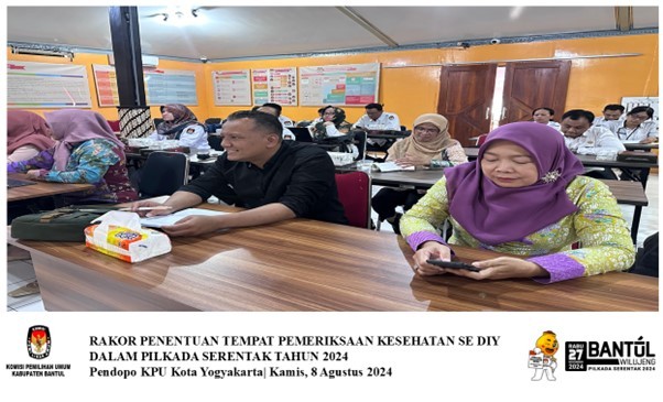 Kamis, 8 Agustus 2024 – KPU Kabupaten Bantul menghadiri rapat koordinasi penentuan tempat pemeriksaan kesehatan yang diselenggarakan oleh KPU Daerah Istimewa Yogyakarta bertempat di pendopo KPU Kota Yogyakarta, hadir dalam rakor mewakili KPU Bantul, Mestri Widodo, Denny Widyaningsih dan Diwangkara Nafi Al Mufti.