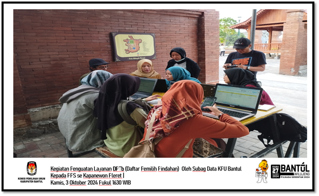 Kamis , 3 Oktober 2024, Pukul 16.00 WIB Tim Subag Data KPU Bantul melakukan kegiatan turun ke lapangan untuk penguatan Layanan Daftar Pemilih Pindahan (DPTb) dalam Pilkada Bantul 2024. Dimulai dari PPK dan PPS se Kapanewon Pleret yang menginisiasi kegiatan ini untuk menghadirkan Ayu Putriningtyas (Kasubag), Satrio Widodo dan Astri Veviana (staff) bagian data KPU Bantul.