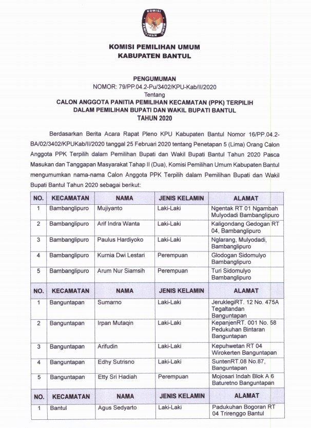 Komisi Pemilihan Umum Kabupaten Bantul menerbitkan Pengumuman Nomor:79/PP.04.2-Pu/3402/KPU-Kab/II/2020 tentang Calon Anggota Panitia Pemilihan Kecamatan (PPK) Terpilih dalam Pemilihan Bupati dan Wakil Bupati Bantul Tahun 2020.