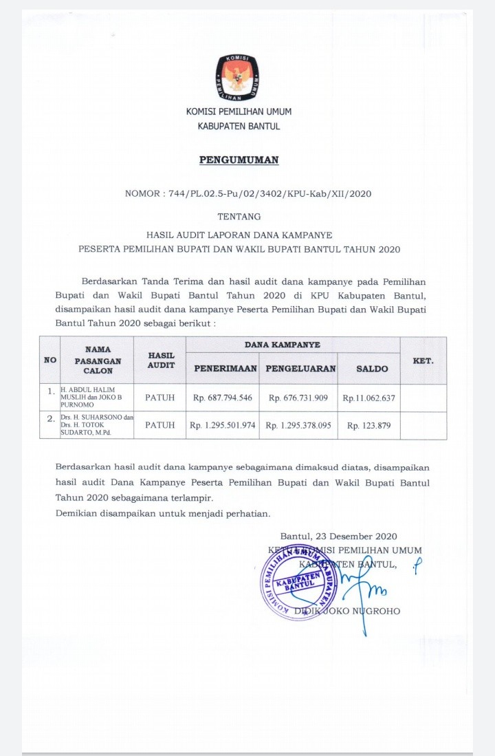 Pada hari ini, Rabu, 23 Desember 2020, KPU Bantul mengeluarkan pengumuman nomor 744/PL.02.5-Pu/02/3402/KPU-Kab/XII/2020 tentang Hasil Audit laporan Dana Kampanye Peserta Pemilihan Bupati dan Wakil Bupati Bantul Tahun 2020. Untuk lebih lengkapnya, pengumuman bisa dilihat di sini.