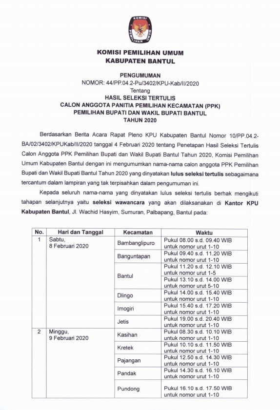 PENGUMUMAN HASIL UJIAN TERTULIS SELEKSI CALON PPK KAB. BANTUL. KPU Kab. Bantul menerbitkan Pengumuman No 44/PP.04.2-Pu/3402/KPU-Kab/II/2020 tentang hasil seleksi tertulis Calon Anggota PPK Kab. Bantul. untuk selanjutnya bagi peserta yg dinyatakan lolos dapat mengikuti tahap selanjutnya yaitu wawancara sesuai jadwal yang sudah ditentukan. Terimakasih.