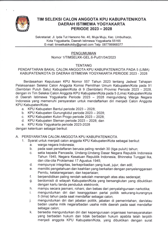Pengumuman Pendaftaran Bakal Calon Anggota KPU Kabupaten/Kota se- DIY Periode 2023 - 2028 dapat diunduh di Pengumuman Pendaftaran KPU Kab/Kota