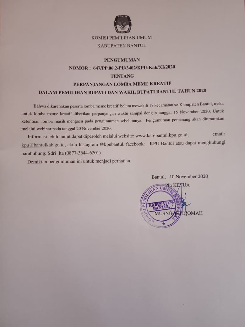 Bahwa dikarenakan peserta lomba meme kreatif belum mewakili 17 kecamatan se-Kabupaten Bantul, maka untuk lomba meme kreatif diberikan perpanjangan waktu sampai dengan tanggal 15 November 2020. Untuk ketentuan lomba masih mengacu pada pengumuman sebelumnya. Pengumuman pemenang akan diumumkan melalui webinar pada tanggal 20 November 2020.