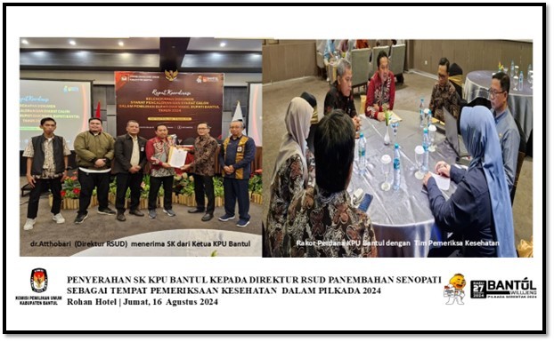 Jumat, 16 Agustus 2024 – Ketua KPU Kabupaten Bantul menyerahkan SK KPU Bantul No 451 Tahun 2024 kepada Direktur Rumah Sakit Umum Daerah Panembahan Senopati, Bapak dr. Atthobari. Acara penyerahan dilaksanakan dalam Rapat Koordinasi kelengkapan dokumen syarat pencalonan dan syarat calon yang dihadiri oleh perwakilan parpol dan stakeholder terkait di Hotel Rohan Bantul.