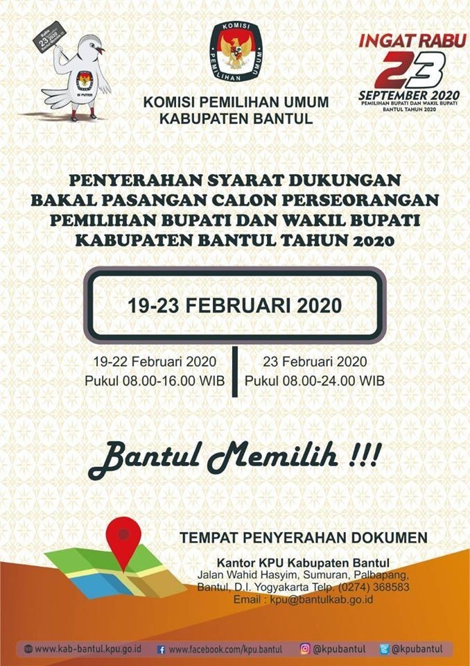 Penyerahan Syarat Dukungan Bakal Pasangan Calon Perseorangan Pemilihan Bupati dan Wakil Bupati Kabupaten Bantul Tahun 2020 adalah tanggal 19-23 Februari 2020
