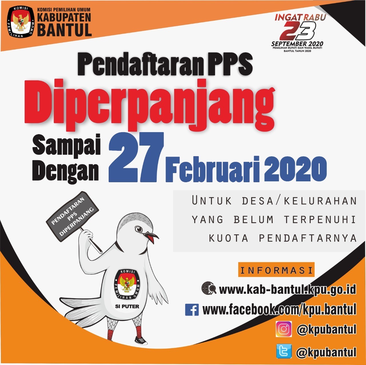 Berdasarkan Pengumuman Komisi Pemilihan Umum Kabupaten Bantul nomor : 70/PP.04.2-Pu/KPU-Kab/II/2020 Tentang Calon Anggota Panitia Pemunggitan Sura (PPS) Pemilihan Bupati dan Wakil Bupati Bantul Tahun 2020, KPU Bantul melakukan perpanjangan Pendaftaran PPS selama 3 (tiga) hari mulai tanggal 25-27 Februari 2020 bagi 33 Desa di 14 Kecamatan yang melum memenuhi jumlah minimal pendaftar. Ke-33 Desa tersebut yaitu