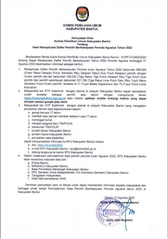 KPU Kabupaten Bantul menerbitkan pers release terkait hasil rekapitulasi Daftar Pemilih Berkelanjutan periode Agustus 2022.