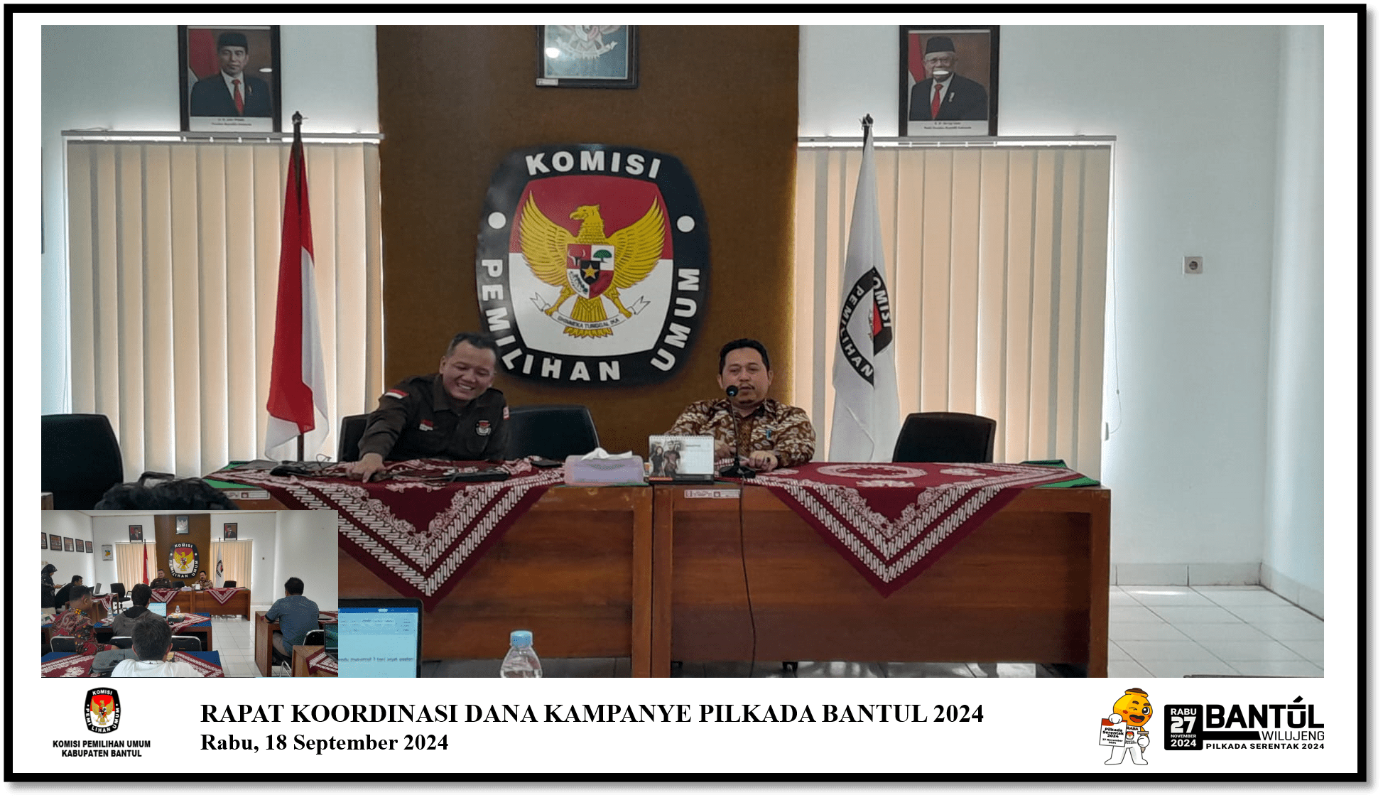 Rabu, 18 September 2024, Pukul 14.00 WIB KPU Bantul mengadakan rapat koordinasi persiapan tahapan kampanye pilkada 2024 untuk Kegiatan Dana Kampanye. Ketua KPU Bantul membuka rakor dengan menegaskan bahwa tahapan pencalonan akan selesai pada saat kegiatan penetapan pasangan calon dan pengundian nomor urut pada tanggal 22 dan 23 September 2024, dilanjutkan dengan tahapan kampanye dengan kegiatan awal pembukaan rekening khusus dana kampanye (RKDK) dan menyampaikan Laporan Awal Dana Kampanye (LADK) sebelum masa kampanye dimulai pada hari Rabu, 25 September 2024.