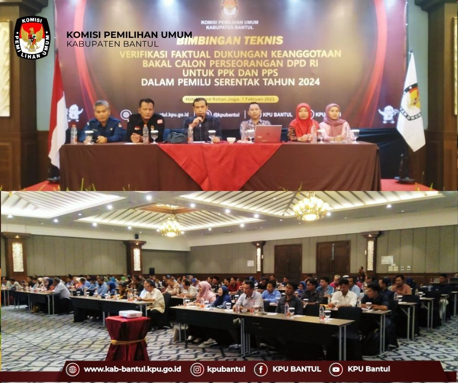 KPU Kabupaten Bantul melakukan bimbingan teknis verifikasi faktual dukungan keanggotaan bakal calon perseorangan DPD RI untuk PPK dan PPS pada hari Selasa, (7/2). Kegiatan yang dilaksanakan di Hotel Grand Rohan Jogja ini dihadiri seluruh undangan yakni 2 orang PPK dan 1 orang PPS se-Kabupaten Bantul.